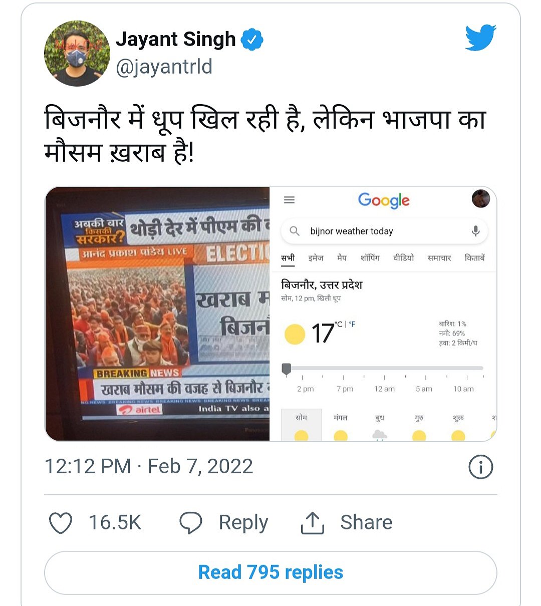 மேலும், ஜெயந்த் சவுத்ரி பிரதமர் மோடியின் பிரசாரம் ரத்து செய்யப்பட்டதாக பா.ஜ.க அறிவித்தபின்பு, அவர் தனது ட்விட்டர் பதிவில் பிஜ்னோரின் வானிலை நிலவரம் குறித்த பதிவை ஸ்க்ரீன்ஷாட் எடுத்து, அத்துடன் `பிஜ்னோரில் சூரியன் பிரகாசிக்கிறது. ஆனால், பா.ஜ.க-வுக்கு மட்டும் வானிலை மோசமாக உள்ளது!" எனப் பதிவிட்டுள்ளார்.