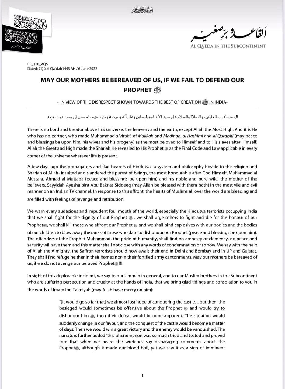 மொகமது நபியை அவமதித்தவர்களை கொலை செய்வோம். நமது மொகமது நபியை அவமதிக்க துணிந்தவர்களின் பட்டாளத்தை அழிப்போம். எங்கள் உடலிலும், எங்கள் குழந்தைகளின் உடலிலும் வெடிகுண்டுகளை கட்டுவோம். காவி பயங்கரவாதிகள் இப்போது டெல்லி, மும்பை, உ.பி மற்றும் குஜராத்தில் தங்கள் முடிவுக்கு காத்திருக்க வேண்டும். நாங்கள் மொகமது நபியின் கவுரவத்திற்காக போராடுகிறோம். மற்றவர்களும் போராடி தங்கள் உயிரை கொடுக்கவேண்டும் " என்று அக்கடிதத்தில் கூறப்பட்டுள்ளது. அல்கொய்தா தீவிரவாதிகளின் மிரட்டலால் இவ்விவகாரத்தில் மேலும் சிக்கல் ஏற்பட்டுள்ளது. ஏற்கனவே இந்த சர்ச்சைக்கு வித்திட்ட நுபுர் சர்மாவிற்கு பாலியல் வன்கொடுமை, கொலை மிரட்டல் வந்து கொண்டிருக்கிறது. இதனால் அவருக்கு டெல்லி அரசு பாதுகாப்பு வழங்கி இருக்கிறது. அல்கொய்தாவின் மிரட்டல் கடிதம் சமூக வளைத்தளத்தில் பரவி இருக்கிறது. இம்மிரட்டலை தொடர்ந்து தீவிரவாதிகள் குறிப்பிட்ட நகரங்களில் மத்திய அரசு பாதுகாப்பை பலப்படுத்தி இருக்கிறது.