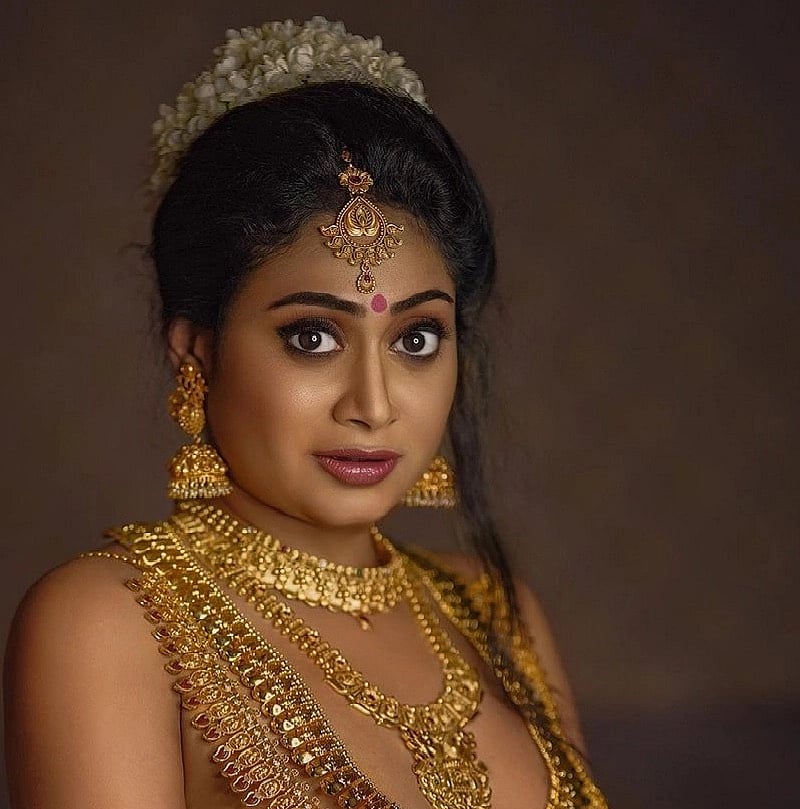 அந்தப் புகைப்படங்களில், தலையில் சுற்றிக்கட்டிய வெள்ளை மல்லிகைப்பூ, இடுப்பில் வெள்ளை வேட்டி சகிதமாக அமர்ந்திருக்கும் ஜானகி சுதீர், மேலாடை அணியாமல் மார்பை மறைக்கும் விதமாக தங்க நகைகள் அணிந்து போஸ் கொடுக்கிறார்.