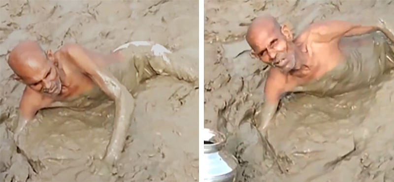 அந்த வீடியோவில், முதியவர் ஒருவர் சதுப்புநில சகதியில் இடுப்பு அளவுக்கு சிக்கிக் கொண்டு தவிக்க, ஒருவர் மரக்கொம்பை முதியவரிடம் கொடுத்து அவரை மீட்க முயல்கிறார். சகதியில் மாட்டிக் கொண்ட முதியவரின் அருகில் அவர் தண்ணீர் பிடிக்க எடுத்துவந்த குடமும் கிடக்கிறது.