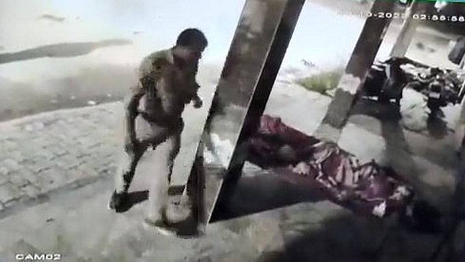 உத்தரப்பிரதேச மாநிலம், மகாராஜ்பூர் பகுதியிலுள்ள சத்மாரா சந்திப்பில், பிரகாஷ் சிங் என்ற காவலர் கடந்த சனிக்கிழமை இரவு ரோந்துப் பணியில் ஈடுபட்டிருந்தார். அப்போது, சாலையின் ஓரத்தில் நிதின் சிங் என்பவர் தூங்கிக்கொண்டிருந்தார். அங்கு ரோந்துப் பணியில் ஈடுபட்டிருந்த பிரகாஷ் சிங் தூங்கிக்கொண்டிருந்தவரிடம் மொபைல் போனைத் திருடியதாகக் குற்றம்சாட்டப்பட்டது.