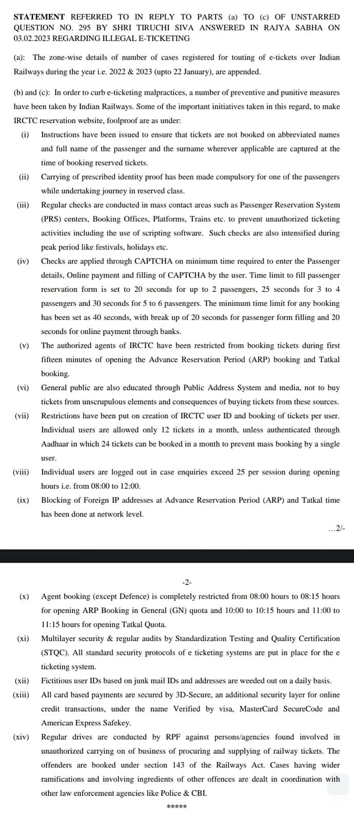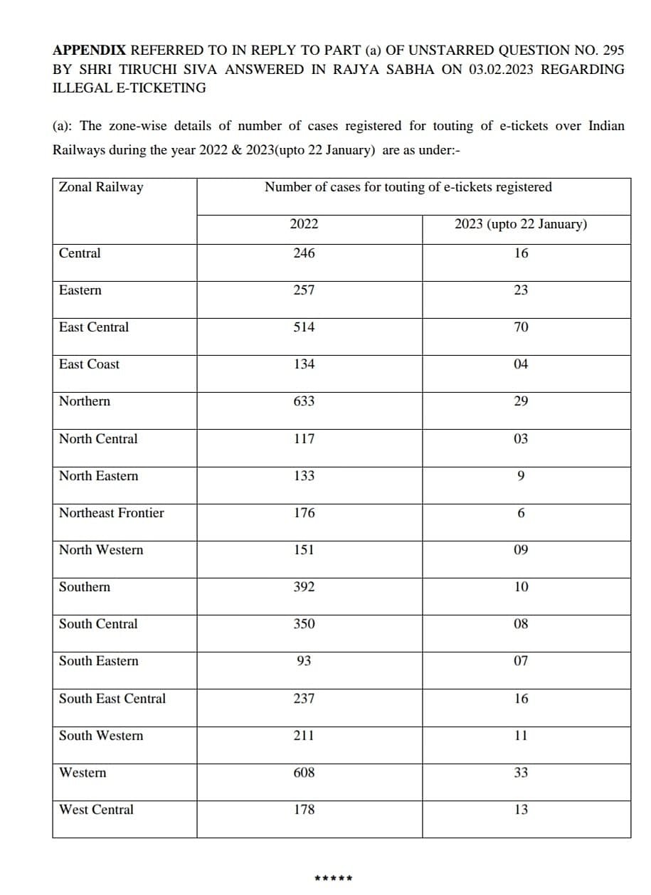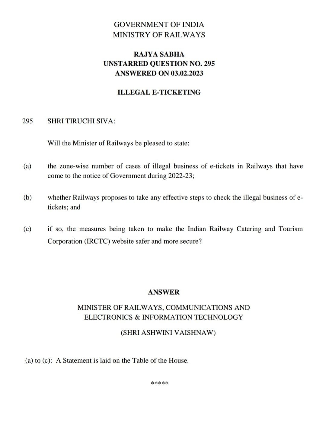 ராஜ்ய சபாவில் தி.மு.க-வைச் சேர்ந்த திருச்சி சிவா எம்.பி, "2022-23-ம் ஆண்டில் அரசின் கவனத்துக்கு வந்த சட்டவிரோத ரயில் இ-டிக்கெட் விற்பனை குறித்து மண்டல வாரியாக பதியப்பட்ட வழக்குகளின் எண்ணிக்கை என்ன... இவ்வாறு சட்டவிரோதமாக டிக்கெட் விற்பனை செய்யப்படுவதை தடுக்க ரயில்வே ஏதேனும் பயனுள்ள நடவடிக்கை எடுத்திருக்கிறதா... அப்படியானால் ஐ.ஆர்.டி.சி-யின் இணையதளம் பாதுகாப்பானதா?" எனக் கேள்விகளை எழுப்பியிருந்தார்.