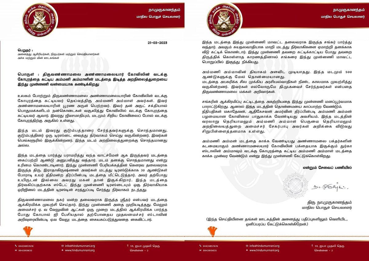 தொன்மையான இந்த மடத்தை அபகரிக்க சில முக்கிய அரசியல்வாதிகள் நீண்ட காலமாக முயற்சித்து வருகின்றனர். இவர்கள் எல்லோருமே தி.மு.கவை சேர்ந்தவர்கள் என்பதை திருவண்ணாமலை மக்கள் அறிவார்கள். சங்கரின் ஆக்கிரமிப்பு கட்டடத்தினை அகற்றியதை இந்து முன்னணி மனப்பூர்வமாக பாராட்டுகிறது. ஆனால் இந்த மடத்தின் தொன்மையை காப்பாற்ற வேண்டும். நீதிபதிகள் மகாதேவன், ஆதிகேசவன் அமர்வின் தீர்ப்பின்படி அம்மணி அம்மன் பழமையான கோவிலை பாதுகாக்க வேண்டியது அவசியம்" என குறிப்பிட்டுள்ளார்.