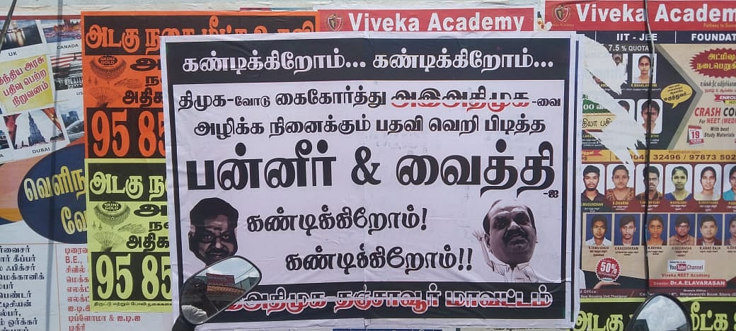 ``தி.மு.கவுடன் கைகோத்து அ.தி.மு.கவை அழிக்க நினைக்கும் ஓ.பி.எஸ், வைத்திலிங்கம் இருவரையும் கண்டிக்கிறோம்" என எடப்பாடி பழனிசாமி தரப்பினர் தஞ்சாவூரில் போஸ்டர் ஒட்டி எதிர்ப்பு காட்டியுள்ளது பரபரப்பை ஏற்படுத்தியுள்ளது.