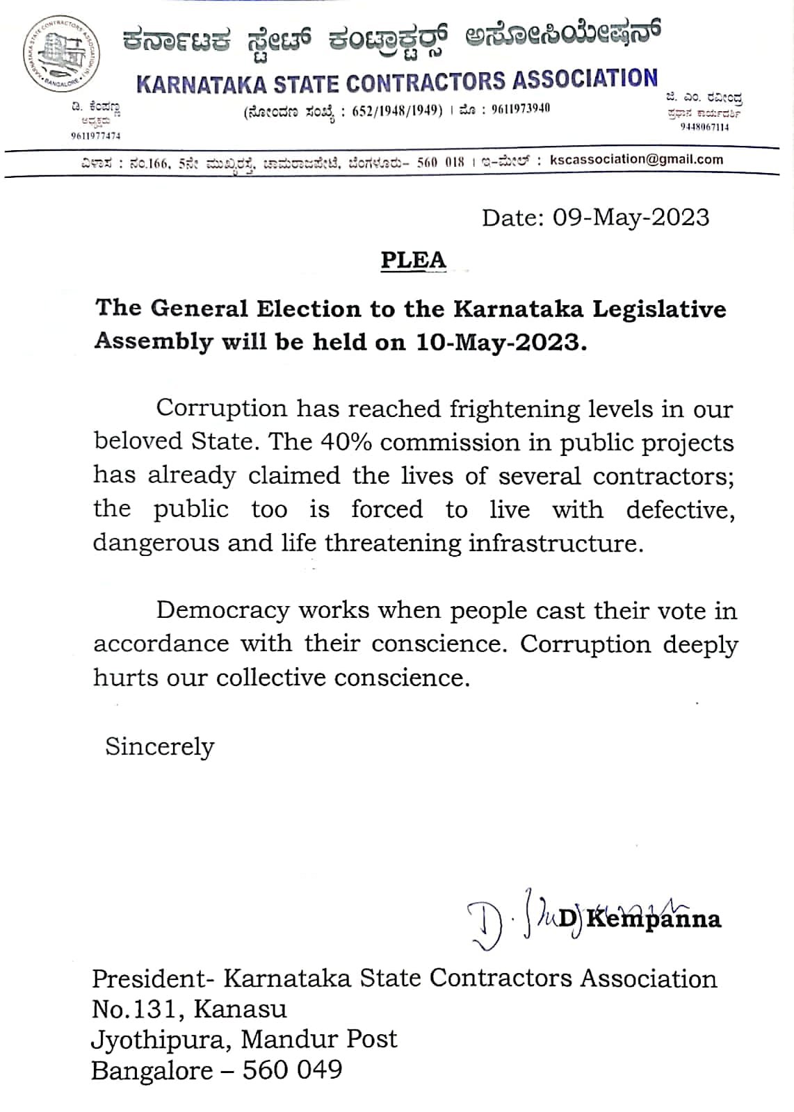 The Karnataka State Contractors Association has written another letter - this time to the voters.