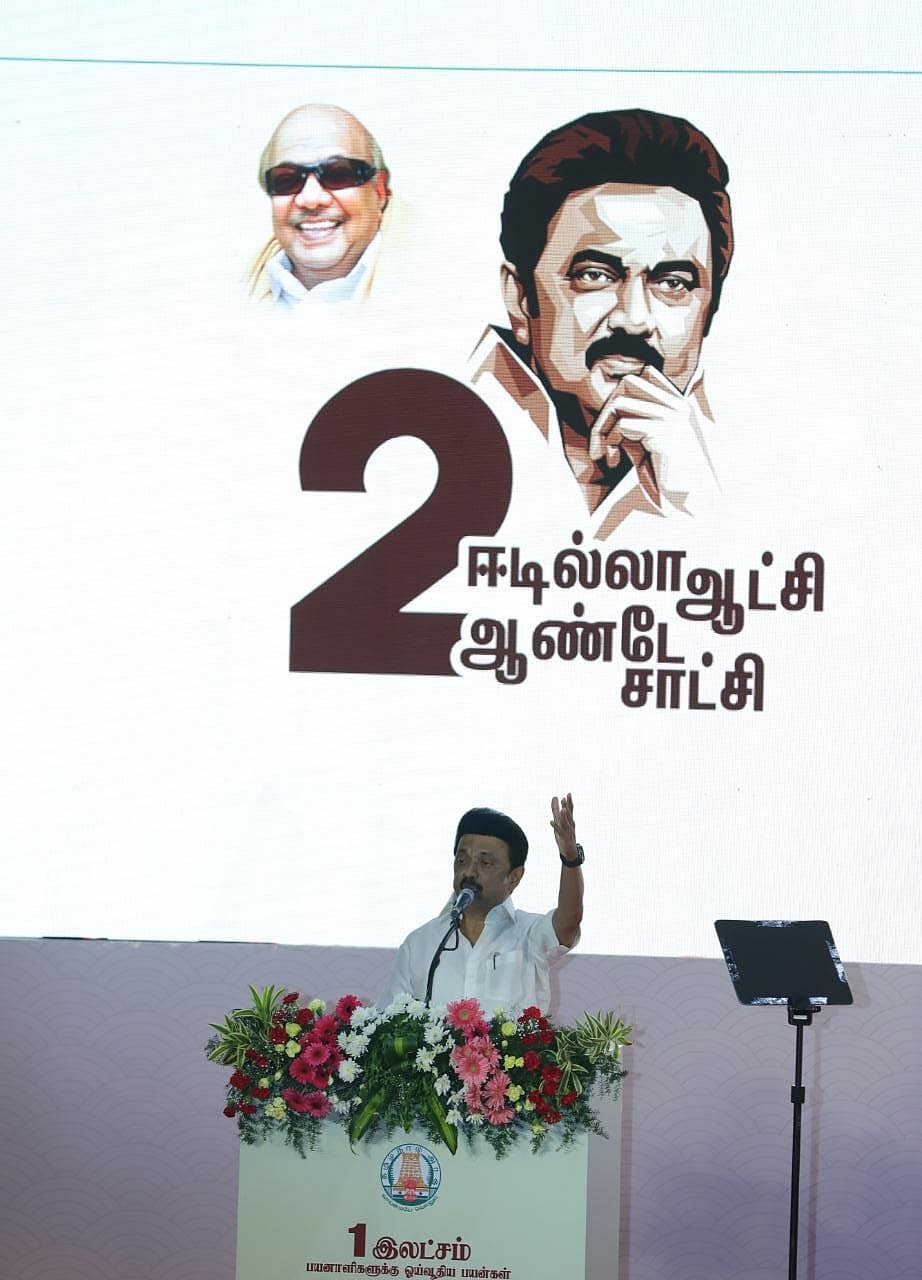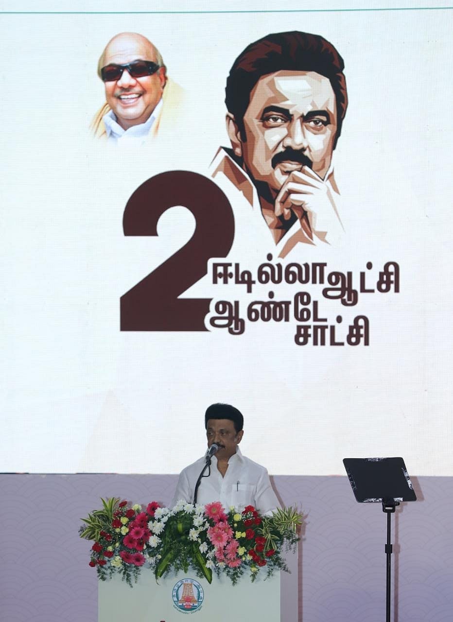 இரண்டு ஆண்டுகளுக்கு முன்னால் இதே நாளில் தமிழ்நாட்டை முன்னேற்றப்பாதையில் கொண்டுச் செல்ல என்னை அர்பணித்துக்கொண்டேன். மக்களின் நம்பிக்கையை, எடுத்துக்கொண்ட பணியை வெற்றிகரமாக செயல்படுத்தி, காப்பாற்ற முடியுமா என எனக்கு நானே கேட்டுக்கொண்ட போது, எனக்கு ஆதரவாக தைரியம் கொடுத்தவர்கள் பெரியார், அண்ணா, கலைஞர் ஆகிய மூவர்தான். ஆயிரமாயிரம் ஆண்டுகளாக சனாதானத்தால் முடங்கிக்கிடந்த திராவிட இனத்தை, தன்னுடைய ஒயாத உழைப்பால் சுயமரியாதைக் கொண்டவர்களாக மாற்றிக்காட்டியவர் பெரியார். சுயமரியாதைப் பெற்றவர்கள், தனக்கான உரிமைகளைப் பெற்றாக வேண்டும் என ஏழை, எளிய மக்களுக்காக சிந்தித்து ஆட்சியை கட்டமைத்தவர் அண்ணா. தன்னுடைய ஆட்சியின் போது இயற்றப்பட்ட சட்டங்கள் மூலம் ஆட்சியின் இலக்கணத்தை இந்தியாவுக்கே இயற்றி காட்டியவர் கலைஞர்.