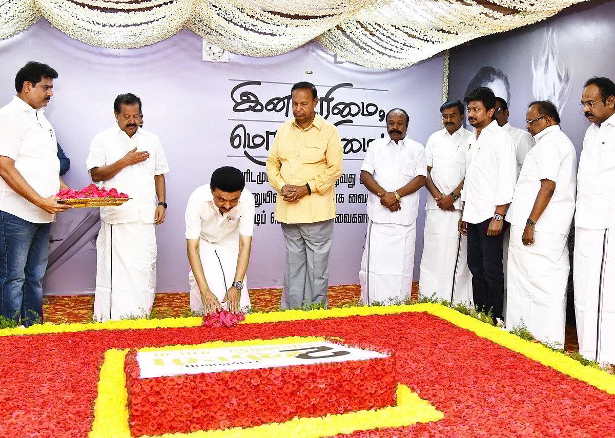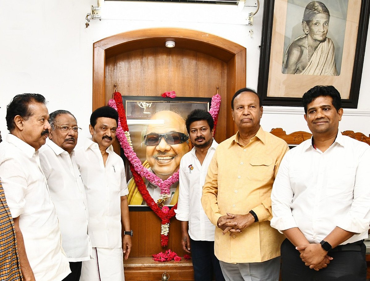 தி.மு.க தமிழ்நாட்டில் ஆட்சிக்கட்டிலில் ஏறி, முழுமையாக இரண்டாண்டுகளை நிறைவு செய்திருக்கிறது. இந்த நிலையில், சென்னை மெரினா கடற்கரையில் அமைந்திருக்கும் பேரறிஞர் அண்ணா, மு.கருணாநிதி ஆகியோரின் நினைவிடங்களில் முதலமைச்சர் மு.க.ஸ்டாலின், அமைச்சர்கள் இன்று காலை மலர்தூவி மரியாதை செலுத்தினர்.