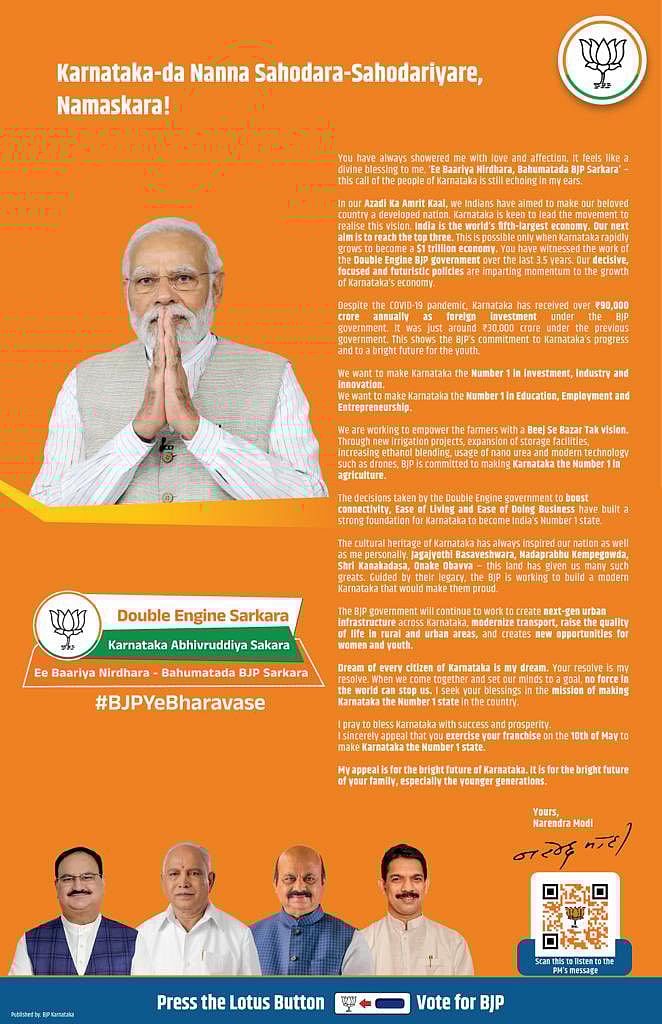 நரேந்திர மோடி பெயரிலுள்ள ட்விட்டர் பக்கத்திலும், பா.ஜ.க-வின் ட்விட்டர் பக்கத்திலும் அந்த வீடியோ வெளியிடப்பட்டது. “கர்நாடக மக்களின் கனவுகளே தன்னுடைய கனவுகள்” என்று அந்த வீடியோவில் மோடி கூறியிருக்கிறார். மேலும், “நாட்டின் பொருளாதார வளர்ச்சியில் கர்நாடகா குறிப்பிடத்தக்க பங்கை வகித்திருக்கிறது. உலகில் ஐந்தாவது பெரிய பொருளாதாரமாக இந்தியா இருக்கிறது. விரைவில், மூன்று பெரிய பொருளாதார நாடுகளில் ஒன்றாக இந்தியா வளருவதை நாம் உறுதிப்படுத்த வேண்டும். கர்நாடகாவின் பொருளாதாரம் வேகமாக வளரும்போது, இந்தியாவின் பொருளாதார வளர்ச்சி சாத்தியமாகும்” என்று கூறியிருக்கிறார் மோடி.