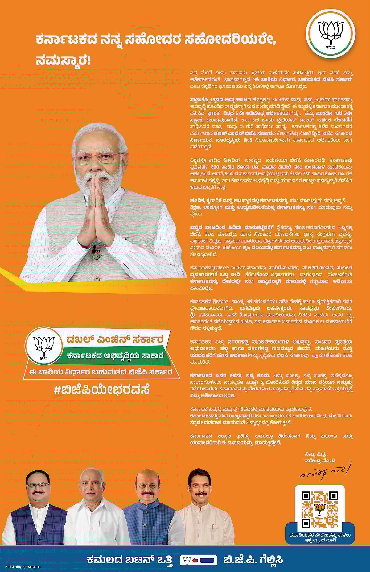 எட்டரை நிமிடங்களுக்கு ஓடக்கூடிய அந்த வீடியோவில், “முதலீடு, தொழில் ஆகியவற்றில் நம்பர் ஒன் மாநிலமாக கர்நாடகாவை கொண்டுவர விரும்புகிறோம். கல்வி, வேலைவாய்ப்பு ஆகியவற்றிலும் நம்பர் ஒன் மாநிலமாக கர்நாடகாவை கொண்டுவர விரும்புகிறோம். விவசாயத்திலும் நம்பர் ஒன் மாநிலமாக கர்நாடகாவை கொண்டுவர பா.ஜ.க முயல்கிறது” என்று கூறிய மோடி, “ஆகவே, கர்நாடகாவை நம்பர் ஒன் மாநிலமாக மாற்றுவதற்கு, மே 10-ம் தேதி பொறுப்புள்ள குடிமக்களாக உங்கள் வாக்குகளைச் செலுத்துமாறு கேட்டுக்கொள்கிறேன்” என்று வேண்டுகோள் விடுத்தார்.