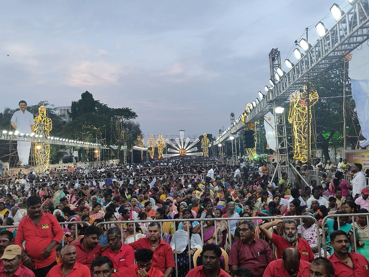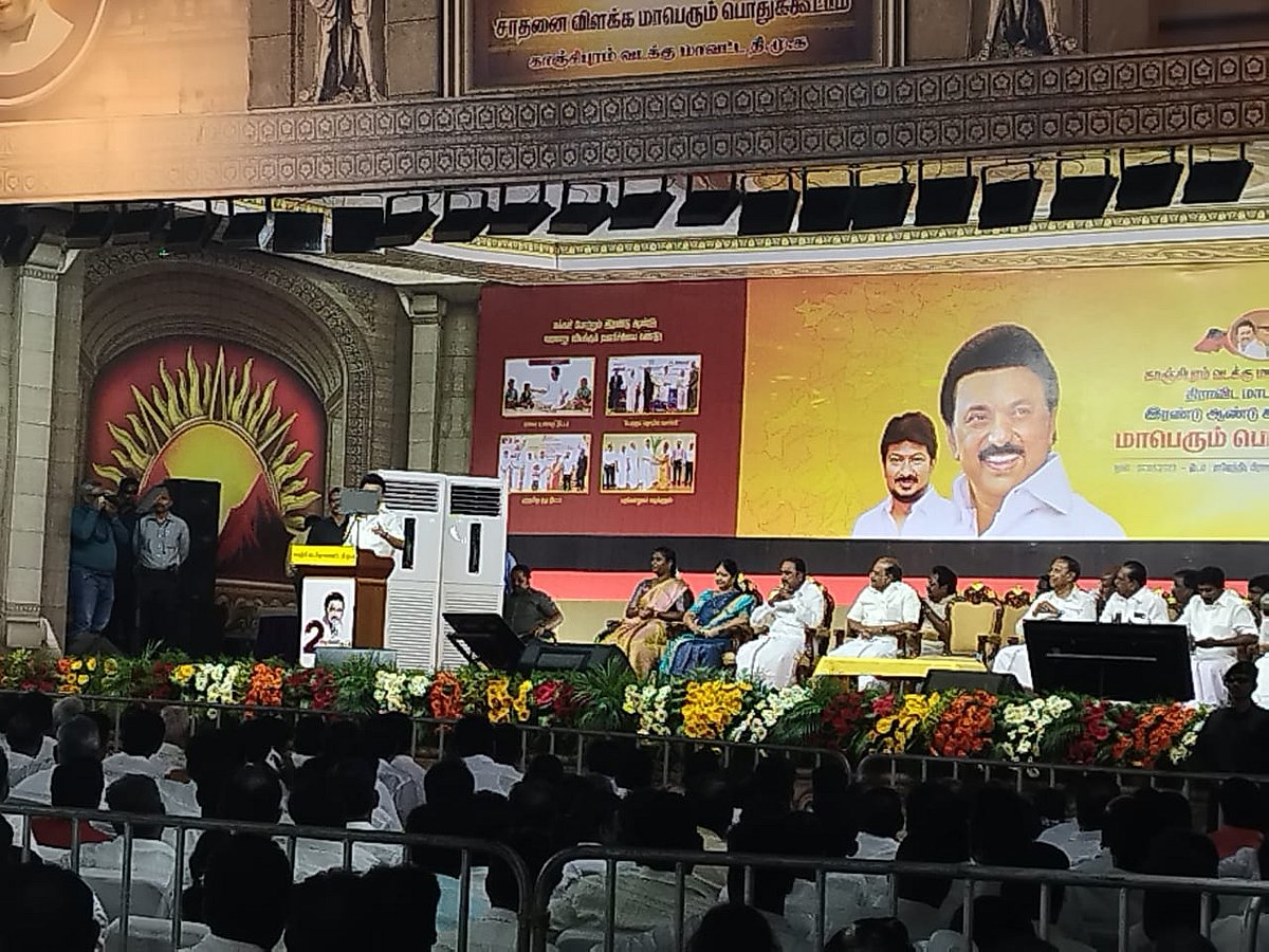 ’முத்துவேல் கருணாநிதி ஸ்டாலின் எனும் நான்’ இரண்டு ஆண்டுகளுக்கு முன்பு இதே நாளில், உங்கள் பேரன்போடு முதலமைச்சராக பொறுப்பேற்றேன். ஆறாவது முறையாக அன்னைத் தமிழ்நாட்டை ஆளும் பொறுப்புக்கு வந்துள்ள திராவிட முன்னேற்றக் கழக ஆட்சியானது – சீரோடும் சிறப்போடும் நடைபெற்றுக் கொண்டு இருக்கிறது. ‘திராவிட மாடல்‘ அரசின் இரண்டு ஆண்டு சாதனைகளை விளக்கி தமிழ்நாடு முழுவதும் 1,222 பொதுக்கூட்டங்களை இன்றும், நாளையும், நாளை மறுநாளும் ஏற்பாடு செய்திருக்கிறார்கள். மூன்றே நாட்களில் 1,222 கூட்டங்கள் நடைபெறுவது என்பது இதுவரை நடைபெறாத எண்ணிக்கை. இது ஒரு வரலாற்றுச் சாதனை. நமது சாதனைகளை 100 கூட்டத்திலோ 200 கூட்டத்திலோ சொல்லிவிட முடியாது. 1,000 கூட்டத்தில் சொல்லும் அளவிற்கு நாம் சாதனைகளைச் செய்திருக்கிறோம்.