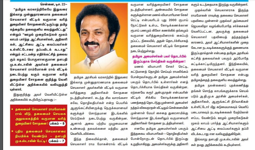 2016-ம் ஆண்டு வெளியிடப்பட்டதாக முதலமைச்சர் சொல்லும் அறிக்கையிலும், ``வருமான வரித்துறையினர் சோதனை நடத்தியிருப்பது தமிழகத்துக்கான தலைகுனிவு. தமிழக நலன்களை புறக்கணித்து தங்கள் சொந்த லாபங்களுக்காக செயல்படும் அதிமுக அரசின் அமைச்சர்கள் அதிகாரிகள் ஆளுங்கட்சி நிர்வாகிகள் உள்ளிட்டோர் மீது கடுமையாகவும் வெளிப்படையாகவும் நடவடிக்கை மேற்கொள்ளப்பட வேண்டும். ஊழல் முறைகேடுகள் மூலம் லாபம் பார்த்த ஆட்சியாளர்களும் ஆட்சியை ஆட்டி வைப்பவர்களின் தப்பி விடக்கூடாது” என அறிக்கையில் குறிப்பிட்டுள்ளார்.