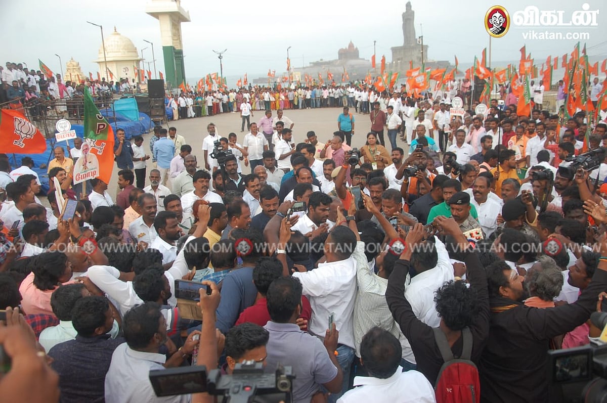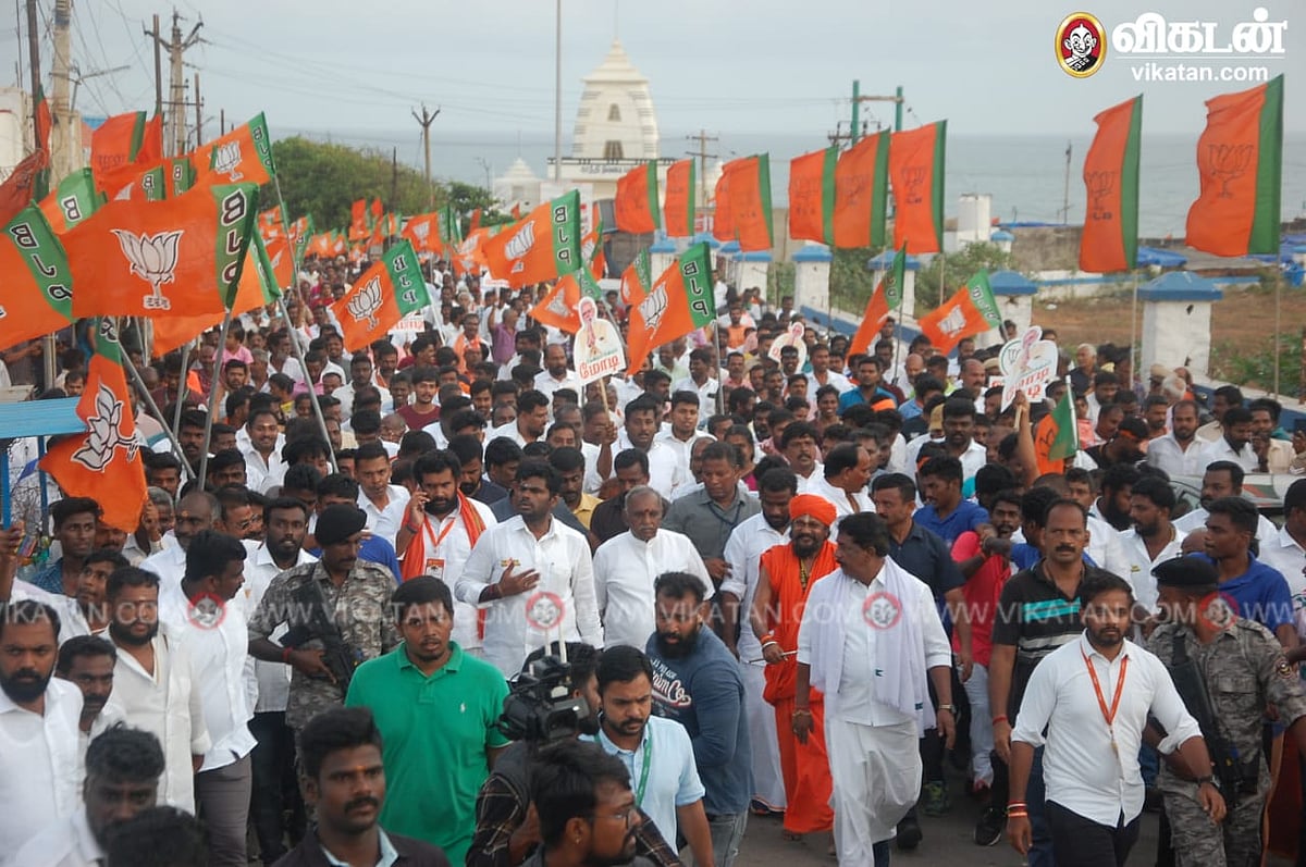 அமைச்சர் மனோ தங்கராஜ் பேசுவதைப்போன்றே காவல்துறையினரும் பேசுவது ஆச்சர்யமாக இருக்கிறது. குமரி மாவட்டத்தில் நடைப்பயணத்தில் கிறிஸ்தவ மக்கள் 25 பைபிள்களை எனக்கு வழங்கினார்கள், இஸ்லாமியர்கள் 8 குரான்களை எனக்குப் பரிசாகக் கொடுத்திருக்கிறார்கள். நான் கடந்தமுறை வரும்போது இரண்டு ஜெபமாலைகள் கொடுத்தார்கள். நான் அதை பூஜை அறையில் வைத்துப் பூஜை செய்கிறேன். ஆனால் போலீஸார் சர்ச், மசூதி பக்கத்தில் கொடிகட்டக் கூடாது என்கிறார்கள். பிரதமருக்கு 13 நாடுகள் உச்சபட்ச விருதுகள் கொடுத்திருக்கின்றன. அதில் 7 நாடுகள் இஸ்லாமிய நாடுகள். பிரதமர் கட்சியின் தொண்டர்கள் நாங்கள். இது போன்ற நிலையில் சர்ச், மசூதி பக்கத்தில் கொடி கட்டாதீர்கள் என காவலர்கள் பேசக் கூடாது. பத்மநாபபுரம் தொகுதியில் நடைப்பயணத்தின்போது சர்ச்சுக்குள் பிரார்த்தனை செய்துகொண்டிருந்தவர்கள் எங்களுக்கு வாழ்த்து தெரிவித்தார்கள். மதத்தை உடைத்துவிட்டு, அவர்கள் மனதில் பா.ஜ.க பதிந்துவிட்டது. மனிதர்களை இணைப்பதற்காக கிடைத்ததுதான் காவலர் பணி. காற்று அடிக்கும்போது கோபுரத்தில் எச்சில் இலை ஒட்டி இருக்கும். அதுபோல எச்சி இலைகளுக்கு சல்யூட் அடிக்கும் வேலை எங்களுக்குக் கிடையாது. மதத்தை வைத்து கருணாநிதி செய்த பிரிவினையை காவலர்களான நீங்களும் செய்யாதீர்கள்.