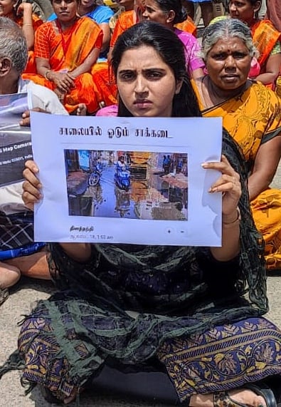 நேற்று வெயிலிலும் ஒரு மணி நேரத்திற்கு மேலாக ஜெய்ஹிந்துபுரம் பகுதியில் சாலையில் அமர்ந்து லக்சிகா ஸ்ரீ போராட்டம் நடத்தினர்.