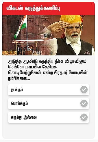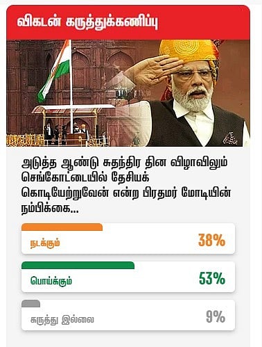 இந்தக் கருத்துக்கணிப்பில் பல்வேறு தரப்பு மக்கள் பங்குகொண்டு தங்கள் விருப்பத்தைத் தெரிவித்திருந்தார்கள் அதில், "அடுத்த ஆண்டு சுதந்திர தின விழாவிலும் செங்கோட்டையில் தேசியக்கொடியேற்றுவேன் என்று பிரதமர் மோடியின் நம்பிக்கை..." நடக்கும் என 38 சதவிகித மக்களும், பொய்க்கும் என 53 சதவிகித மக்களும், கருத்து இல்லை என 9 சதவிகித மக்களும் கருத்து தெரிவித்திருக்கிறார்கள்.