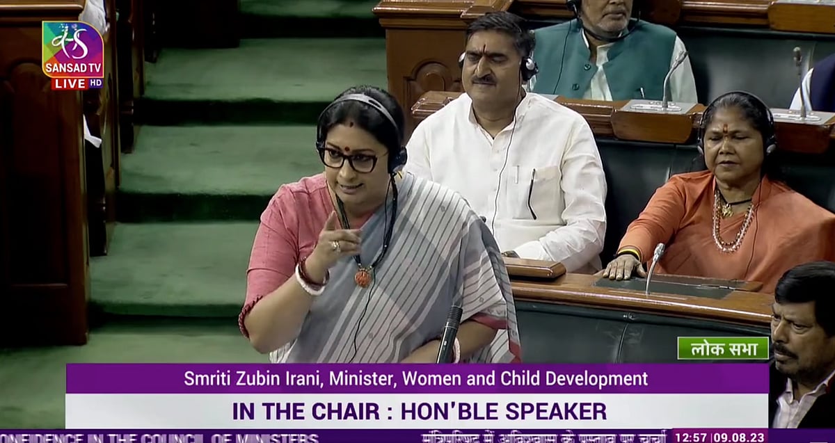 ராகுலின் இத்தகைய பேச்சைக் கேட்டு கொதித்த மத்திய அமைச்சர் ஸ்மிருதி இரானி, ``இதை நான் வன்மையாகக் கண்டிக்கிறேன். வரலாற்றிலேயே முதன்முறையாக ஒருவர்(ராகுல் காந்தி) பாரத மாதா மரணம் பற்றிப் பேசுகிறார், காங்கிரஸ் தலைவர்களும் கைதட்டுகிறார்கள். நீங்கள் இந்தியா அல்ல. இந்தியா தகுதியை நம்புகிறது, வாரிசு அரசியலை அல்ல. ஊழல் இப்போது இந்தியாவை விட்டு வெளியேறுகிறது. வம்ச அரசியல் இந்தியாவிலிருந்து வெளியேறுகிறது. மணிப்பூர் விவகாரம் குறித்து விவாதிக்க அரசு தயார் என்று மத்திய அமைச்சர்கள் பலமுறை கூறினார்கள். ஆனால், எதிர்க்கட்சிகள் தான் அதிலிருந்து ஓடின. என்னைக் கண்டதும் அவர் (ராகுல் காந்தி) அவையிலிருந்து வெளியேறிவிட்டார். அவர் இப்போது ராஜஸ்தானுக்குச் செல்கிறார். அங்குதான் சிறுமி ஒருவர் பாலியல் வன்கொடுமை செய்யப்பட்டு உயிருடன் எரிக்கப்பட்டார்.