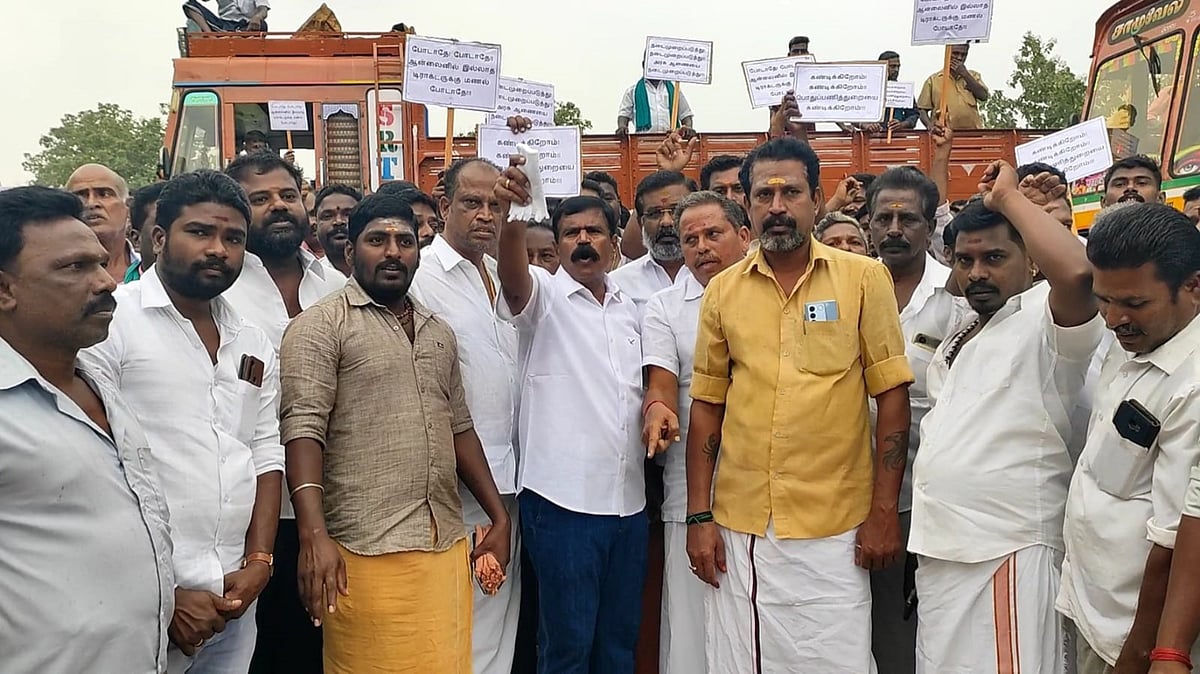 முறையாக அரசாணைப்படி ஆன்லைனில் புக் செய்த லாரிகளுக்கு குறைந்த அளவில் தான் மணல் அள்ள அனுமதிக்கின்றனர். இதனால் லாரி உரிமையாளர்கள் லாரிகளை இயக்க முடியாமல் தவித்து வருகின்றனர். எனவே, டிராக்டர்களில் மணல் அள்ளுவதை அரசு தடை செய்ய வேண்டும் என வலியுறுத்தி தமிழ்நாடு மணல் லாரி உரிமையாளர்கள் சம்மேளனம் சார்பில் தலைவர் ராசாமணி தலைமையில் போராட்டத்தில் ஈடுபட்டோம். இதில் நுாற்றுக்கும் மேற்பட்ட லாரிகளுடன் அதன் உரிமையாளர்களும் கலந்து கொண்டனர்’ எனத் தெரிவித்தனர்.