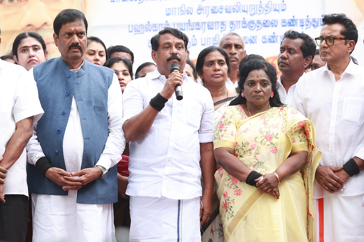 'சமீபத்தில் காஷ்மீரில் இருக்கும் பஹல்காம் பகுதியில் பயங்கரவாதிகள் சிலர் கொடூர தாக்குதல் நடத்தினர். இதில், பொதுமக்கள் 26 பேர் உயிரிழந்தனர். இதைக்கண்டித்து தமிழக பா.ஜ.க சார்பில் எழும்பூரில் கண்டன ஆர்ப்பாட்டம் நடத்தப்பட்டது.